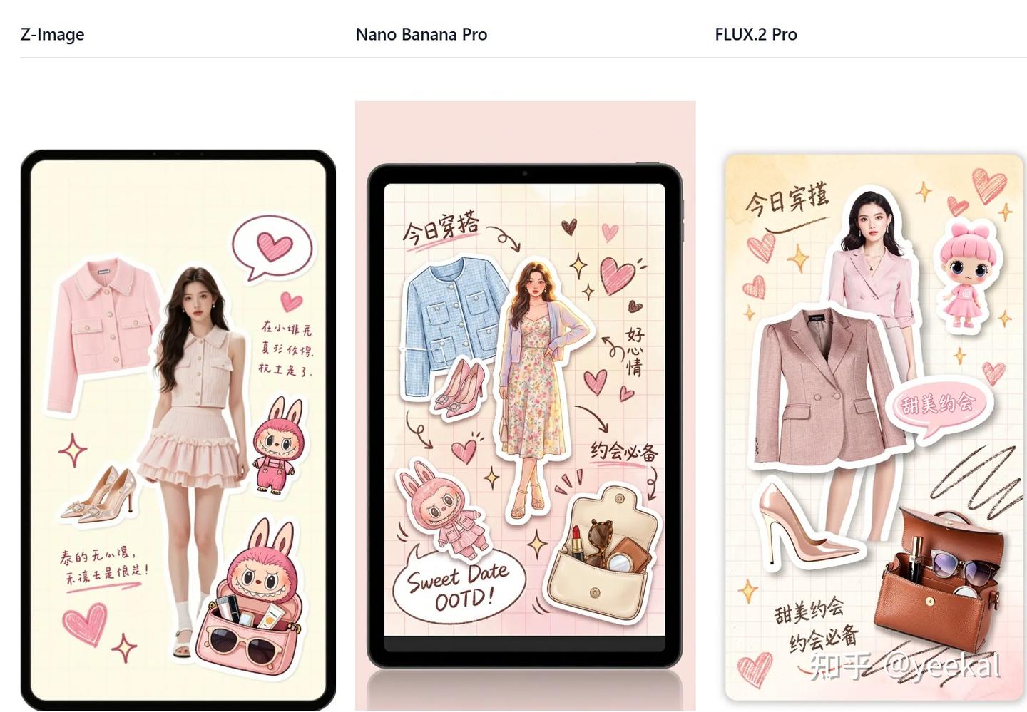 评价:这个场景比较容易出图,但是不适合抠细节。OOTD的元素跟画面主角的穿着没有一个是相对应的,这一块模型都没有成功。但是单就整个场景的视觉校效果完成的都不错。感官上我还是比较喜欢Z-Image的审美和画面搭配。不过比较尴尬的是z-image的文字是瞎编乱造的。nano banana 和FLUX.2的都是正确的。Z-Image不适合让它自己想文字,还是适合提供明确的元素给它。