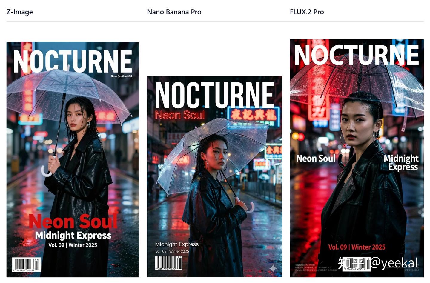 评价:Z-Image 的杂志人物打光比较能突出主体,面部也更柔和,人物更符合我的审美。其他两个人物有点紧绷。虽然这里面要求的文字模型都渲染正确,但是Z-Image在标题下方有一些额外渲染的小字有误。